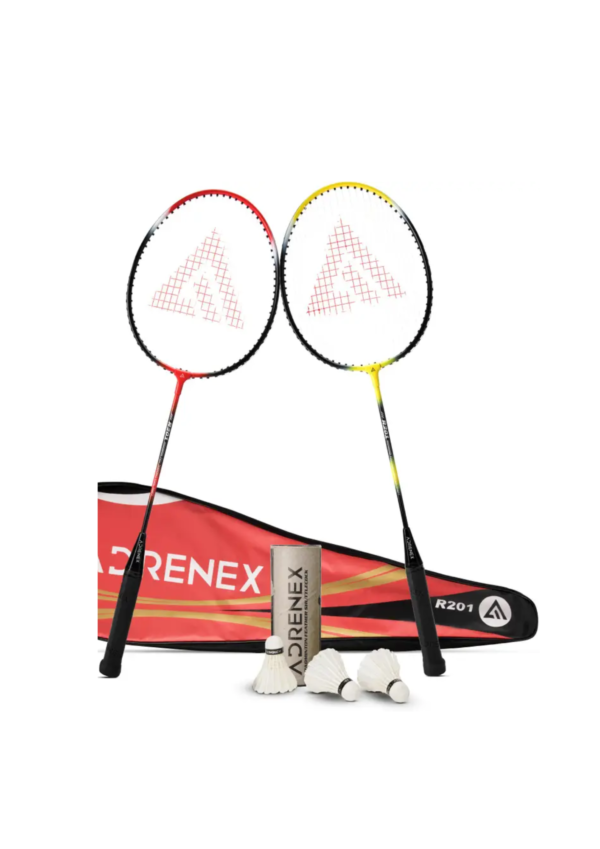 Gear up for exciting badminton matches! The Adrenex badminton kit-combo of two R201 badminton racquets and a pack of 3 feather shuttles is the top choice for beginners and helps in skill upgradation. The aluminium body and steel shaft make it lightweight and highly durable. The ideal racquet size, oval frame, balanced swing weight and PVC foam embossed grip help to deliver precise drop shots. It has a concentrated sweet spot and string tension of 18-20 lbs. The shuttle is 100% rotation tested and has stable flight and balance